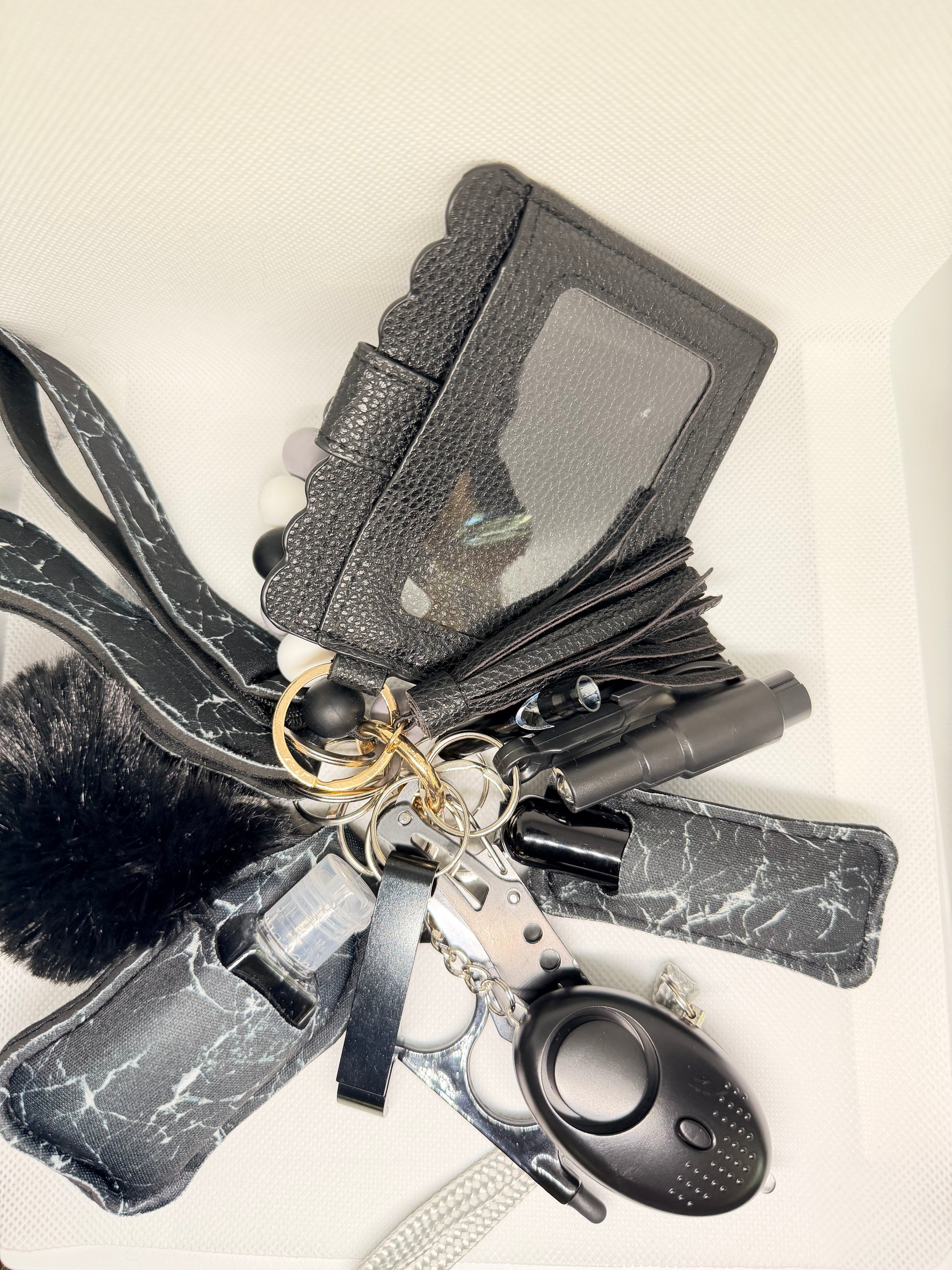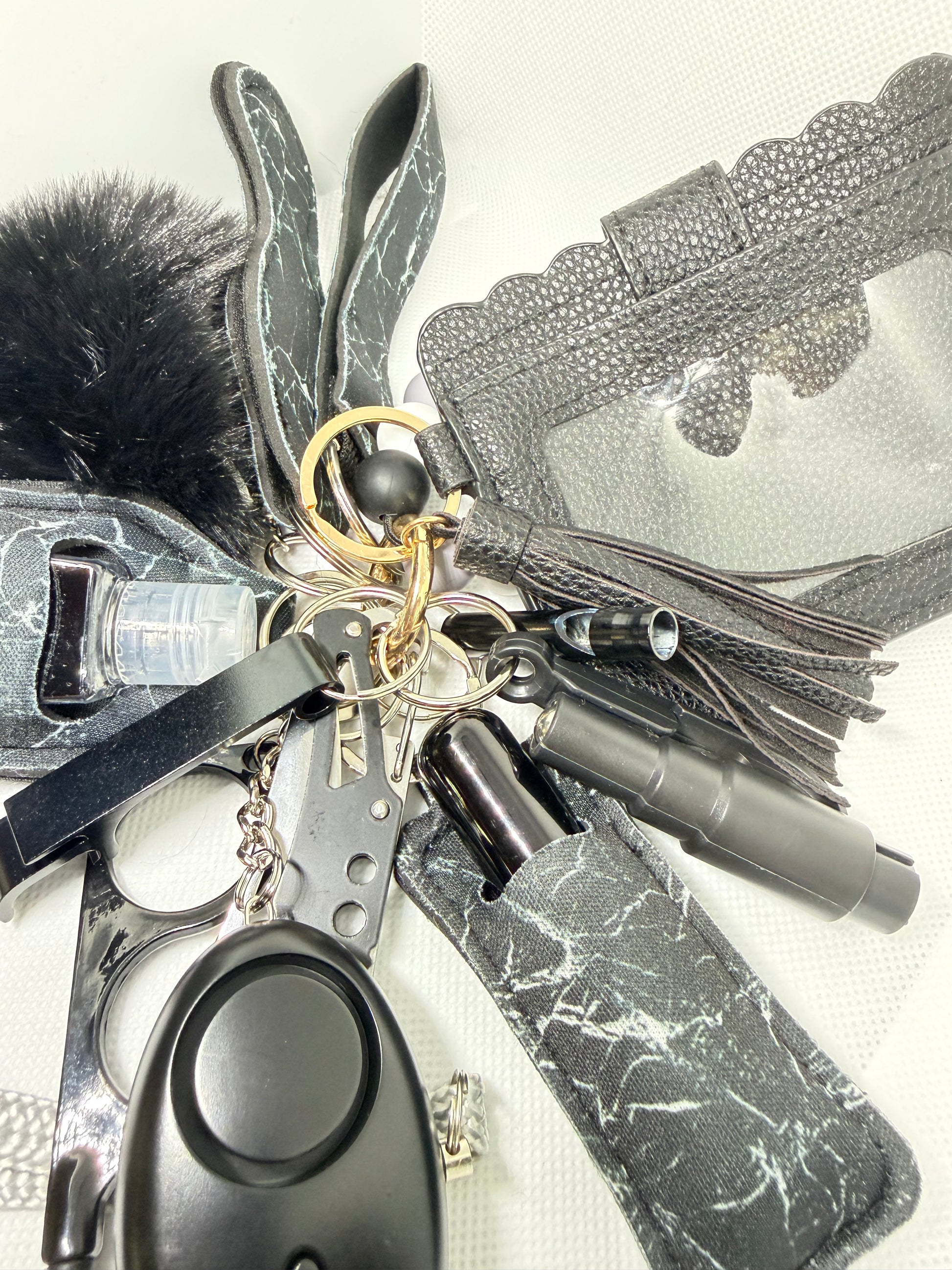 Sanitizer Holder, Window Breaker, Bottle Opener, Whistle, Keychain, Seatbelt Cutter, Alarm, Pom pom, Lipstick Holder, Wallet and Knife and Perfume with Holder.