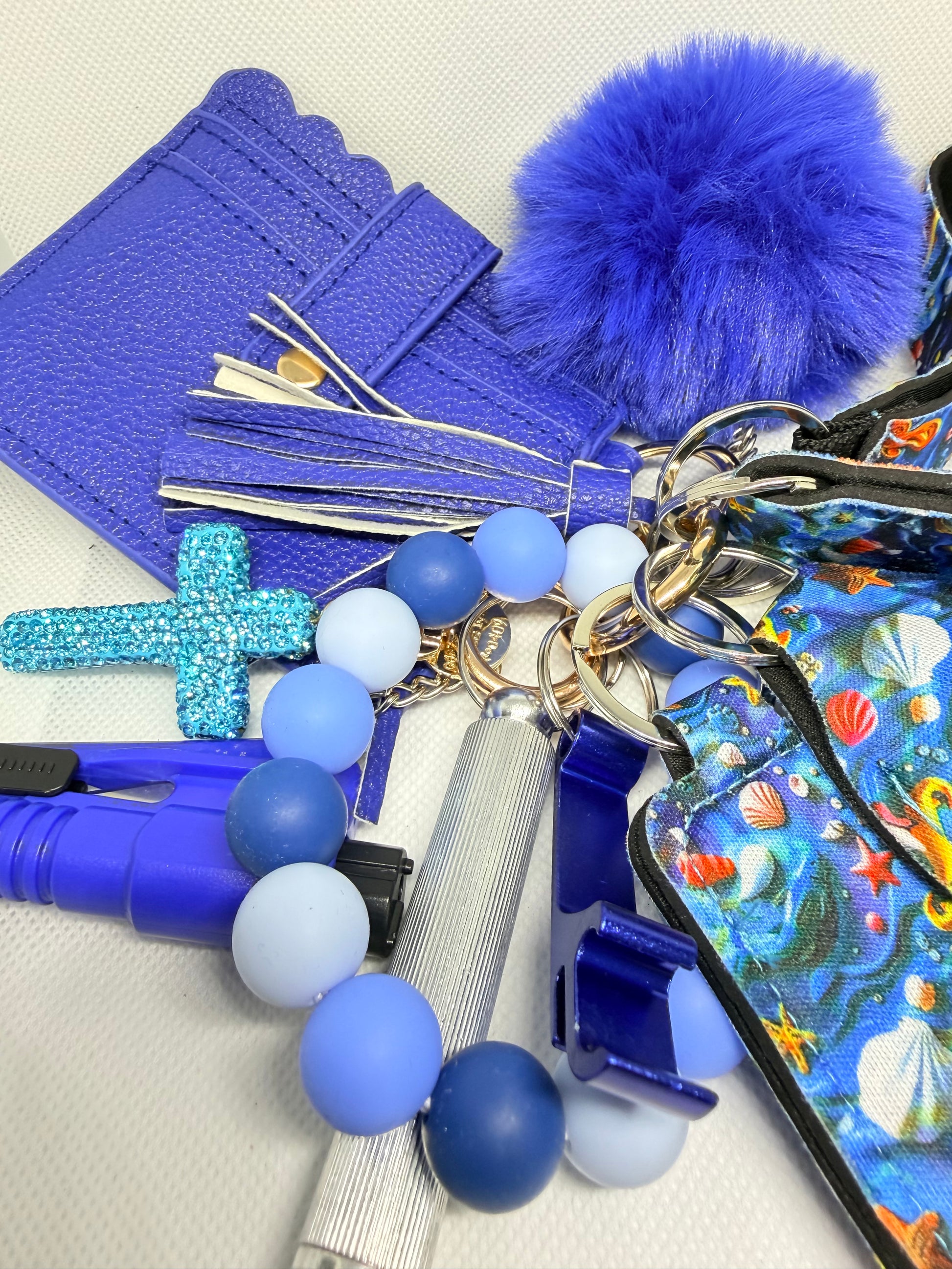 Sanitizer Holder, Window Breaker, Bottle Opener, Whistle, Keychain, Seatbelt Cutter, Pom pom, Lipstick Holder, Wallet, Cross Keychain and Knife.