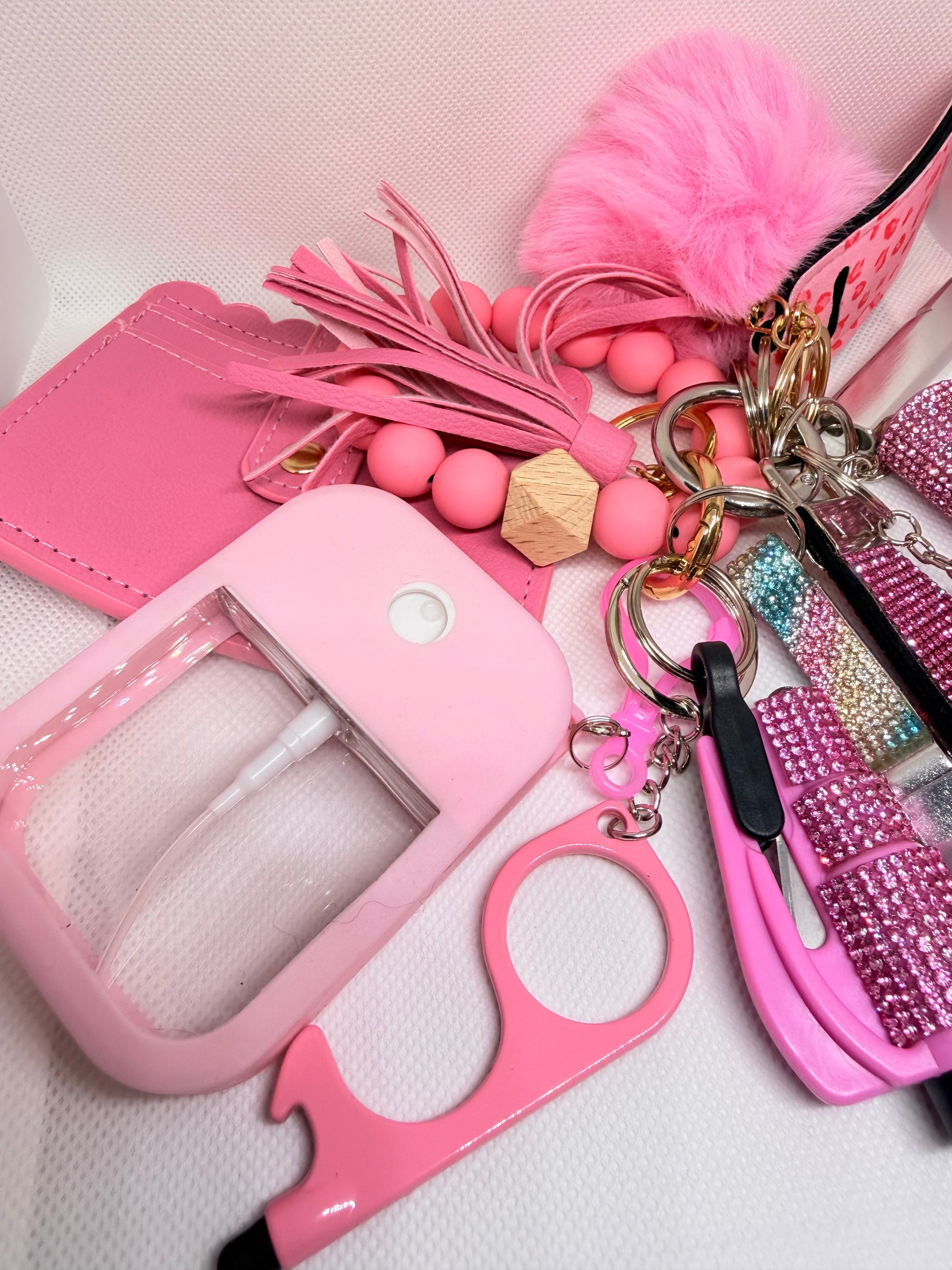 Wallet, Square Sanitizer, Window Breaker, Seatbelt Cutter, Whistle, Bottle Opener, Lipstick Holder, Portable Perfume, Alarm, Keychain and Pom pom.