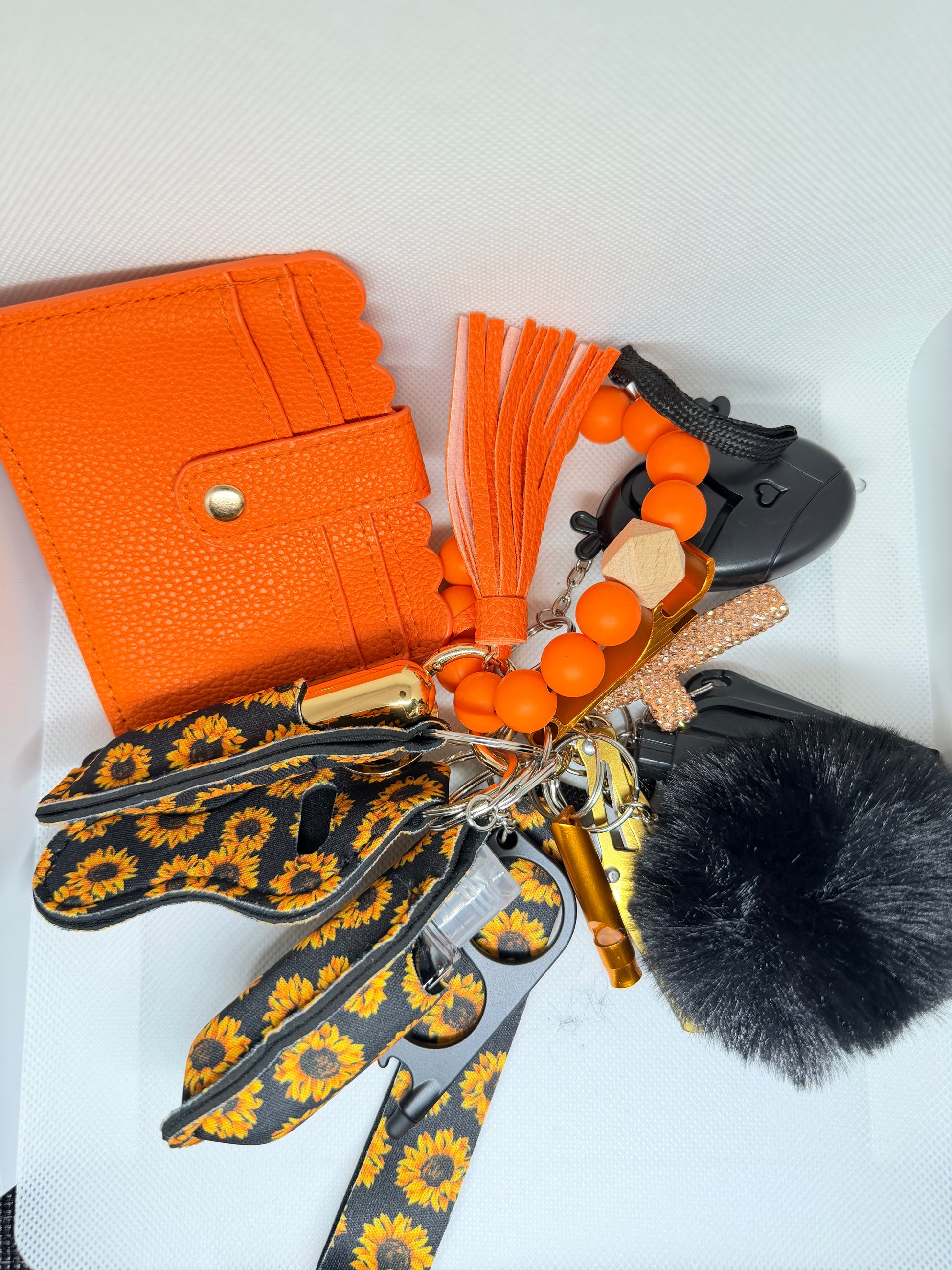 Sanitizer Holder, Window Breaker, Bottle Opener, Whistle, Keychain, Seatbelt Cutter, Alarm, Pom pom, Lipstick Holder, Cross Keychain, Wallet and Knife with Perfume holder.